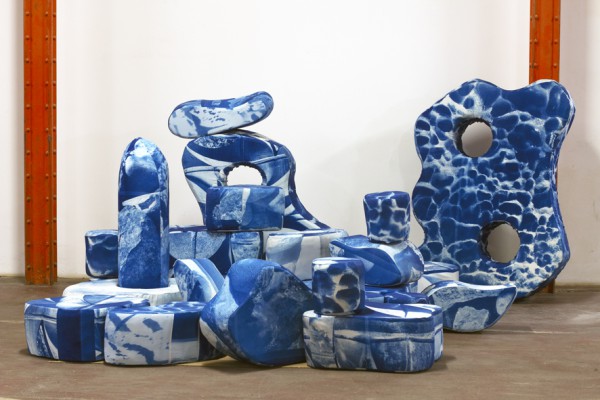 I SMRK, 2023, in cooperation with Marie Athenstaedt, cyanotype on canvas, performed at Studio Bubec Praha, skulptures by Čestmír Suška, photo: Marie Athenstaedt