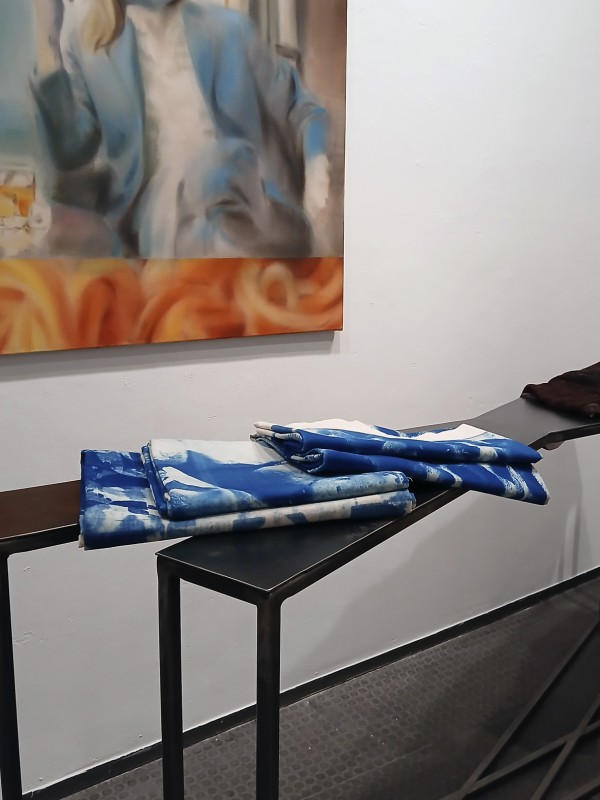 VI Hands up!, 2020, In cooperation with Ivana de Vivanco, cyanotype on canvas, performed at Hostel Eden Leipzig, 2021